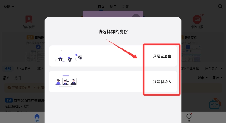3、系统会给出选择身份标签的提示,你需依据自身实际情况,点选“应届毕业生”或者“在职人士”。