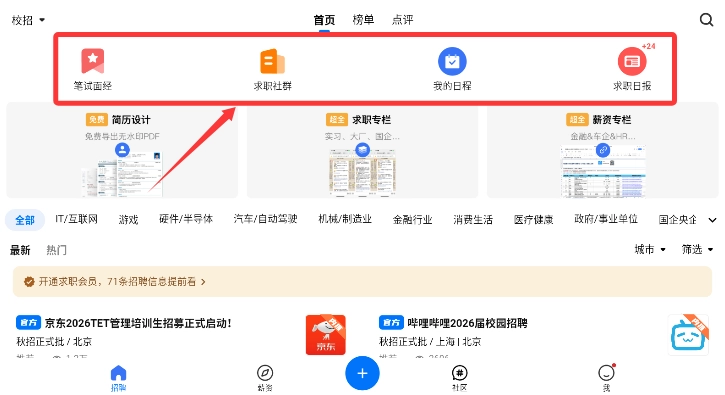 4、注册完成后,主界面会呈现笔试题库、求职圈子等实用功能模块。