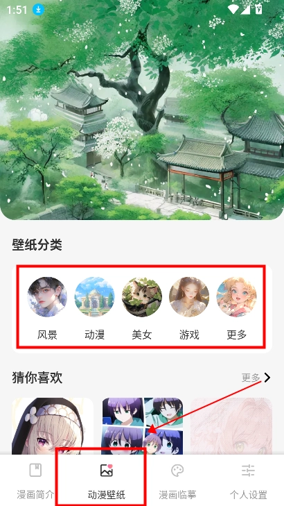 2. 壁纸类型丰富多样,除了现有分类,还有更多类别等待你去探索,同时设有“猜你喜欢”推荐板块。