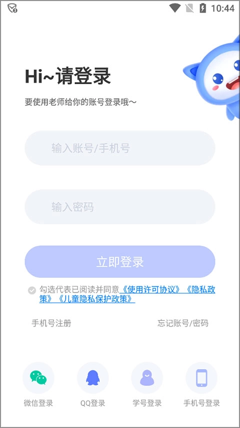 1. 下载并安装好天学英语学生端,可选择通过微信、QQ、学号或手机号登录软件。