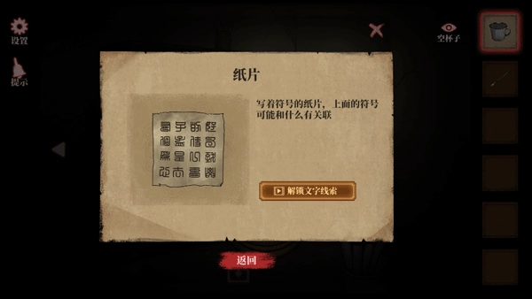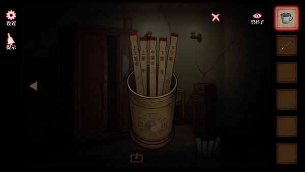 4、下面就是破坏子符来避免山匪的追击,在右边桌子上获取杯子;