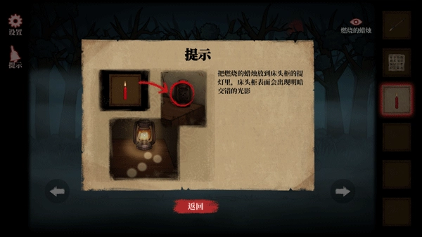 8、在房间里点击左边的方向键切换场景,将蜡烛放入到床头柜上的提灯上,获取四位文字的密码;