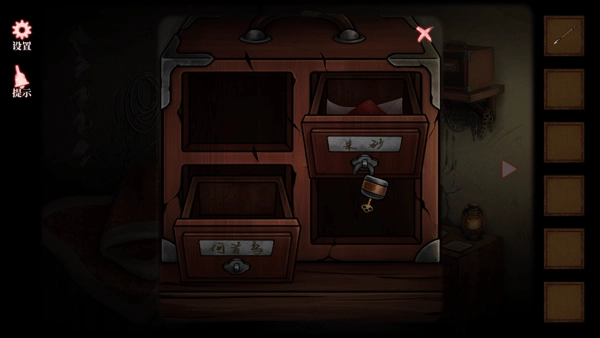 3、接下来就是解救被山匪绑架的姑娘,同样是用簪子将左边柜子的锁打开,打开后获取剪刀,同样你还可以看到柜子里有一个特殊符号锁住的盒子;