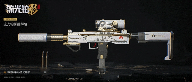 【UZI冲锋枪-流光铂影】的视觉中心被巨大的毛笔字所占据,这些字用金线勾勒边缘,仿佛正遭受战火的炙烤。