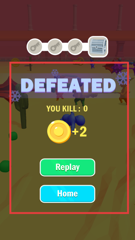3、如果角色在战斗中被打败,屏幕上会出现【DEFEATED】的界面,显示击杀数量和获得的金币。此时可以选择点击Replay按钮重新挑战本关,或者点击Home按钮回到主界面。