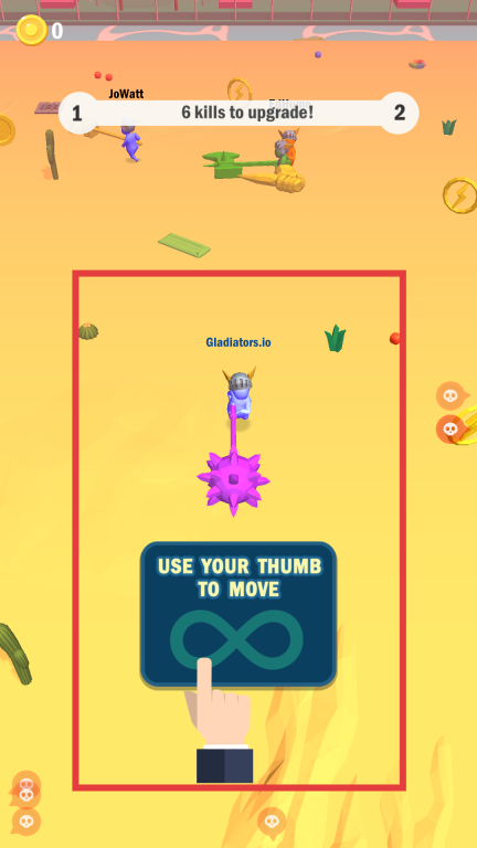 2、开始后根据提示【USE YOUR THUMB TO MOVE】,使用拇指在屏幕上滑动来控制蓝色角斗士的移动,在竞技场内寻找敌人并用流星锤进行攻击,通过积累击杀数来提升等级。