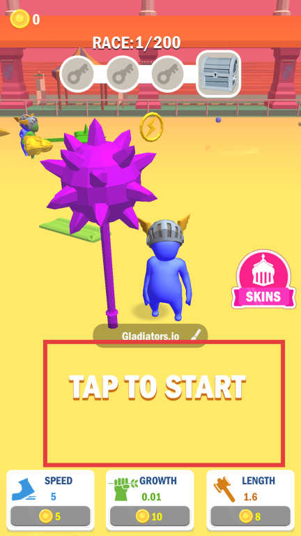1、进入冷兵器大作战的初始界面时,屏幕下方会出现【TAP TO START】按钮。点击此按钮后,将启动游戏流程,角色会被传送至竞技场场景,准备开始战斗。