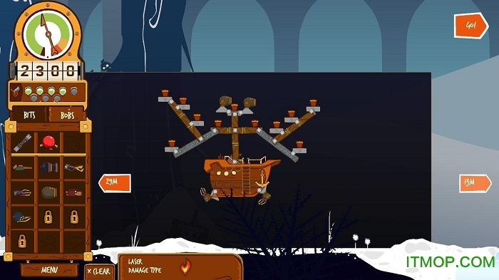 进入游戏后,会有4-5个关卡的教程帮助你熟悉游戏玩法。尽管游戏内容是英文的,但大部分图形化的内容也能让我们自然而然地理解游戏的内涵。每次开始时,游戏都会提供一个基础的两轮车型,而我们需要从左侧的方格中找到可用的配件来组装战车的关键部位,例如机枪位和火炮位等。