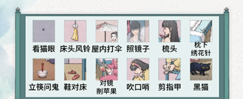生活里有一些被认为会带来不安的场景或行为,比如门上那个能观察外界的小圆孔,床头悬挂着会晃动发声的装饰,在室内撑开遮阳挡雨的工具,对着能映出人影的平面看自己,用梳子打理头发,枕头下方藏着细尖的金属物件,餐桌的碗里竖直插着吃饭用的细棍,鞋子摆放的方向正对着床铺,嘴里发出清脆的哨声,用工具修剪指尖的角质,还有全身黑色毛发的猫咪。