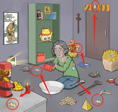 要想让最后的彩票百分百全中,得先找到途中的五只小人,再把它们放到女人面前的盆里才行。