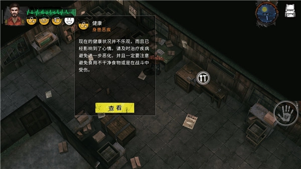 4、健康:当健康值降为零时,玩家会因病死亡。健康值仅在玩家患上疾病时才会减少,疾病类型有受伤(发生于战斗过程中)、内伤(由饮食问题引发)、药物依赖(因嗑药导致)。针对不同疾病,使用相应的药物进行治疗,便可恢复对应的健康值。