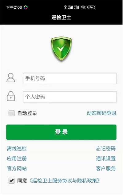 在巡检卫士客户端应用程序中,首先需要填写用于登录的标识信息(通常是移动电话号码)以及对应的访问口令,随后触发登录操作指令,完成身份验证后即可进入应用的核心操作界面。
