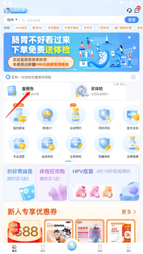 首先我们启动软件,登录自己的账号后,点击首页顶部的【查报告】按钮。