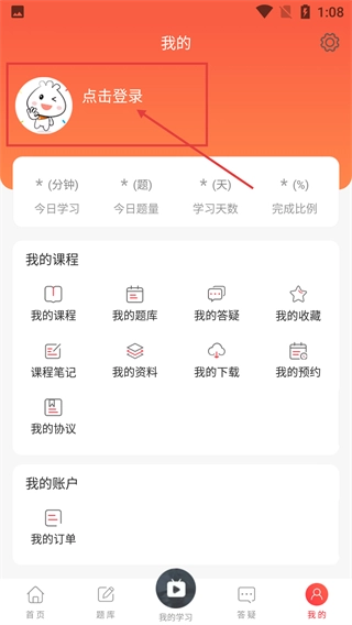 在“我的”页面点击【点击登录】按钮,即可进入登录界面;此页面集成了学习数据统计功能以及【我的课程】等各类功能入口。