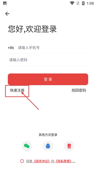 在登录页面选择【快速注册】即可进入注册流程,也可以选择微信、QQ等其他方式登录,但无论选择哪种方式,都需要先同意相关协议。