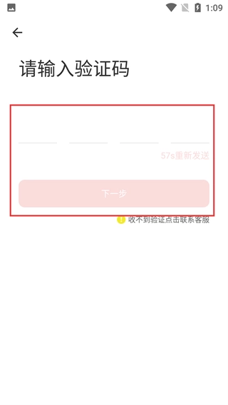 进入验证码输入界面,填写获取到的验证码后点击【下一步】按钮;若验证码超时未使用,可等倒计时结束后选择【重新发送】选项。