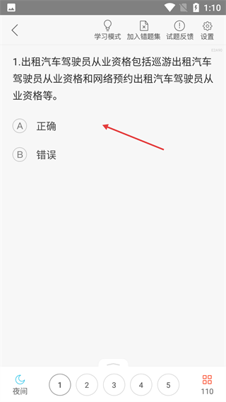 进入具体练习环节后,系统会展示题目内容,例如涉及出租汽车驾驶员从业资格的题目,答题时可选择【正确】或【错误】选项。