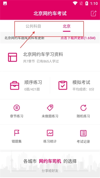 进入软件后,能看到【公共科目】下的【北京】板块,也可获取【北京网约车学习资料】,该资料共包含7章内容,建议先查看资料的更新情况。