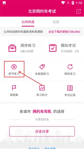 在主界面找到【章节练习】按钮,点击该按钮即可进入对应的练习板块,与此同时,还能看到【公共科目网约车题库资料】的更新提示。