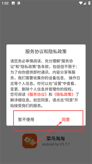 打开应用后会弹出【服务协议和隐私政策】的提示窗口,需要阅读相关内容并选择【同意】按钮来启用服务,也可以选择【暂不使用】选项来关闭该弹窗。