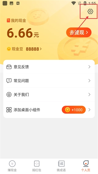 在应用主界面底部点击【个人页】,进入个人中心页面后,就能查看现金余额、现金豆等相关信息。
