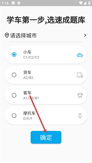 在“学车第一步,选速成题库”页面,选定所在城市与车型(例如小车C1/C2/C3)后,点击【确定】按钮,即可进入软件首页。