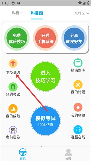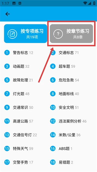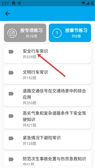 在章节练习列表里,点击【安全行车常识】这一选项,就能启动该章节的练习。