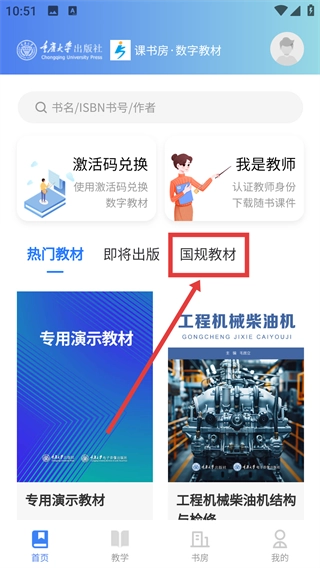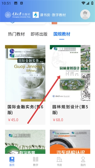 进入课书房数字教材的首页后,找到并点击【国规教材】标签,即可进入国规教材的列表页面。