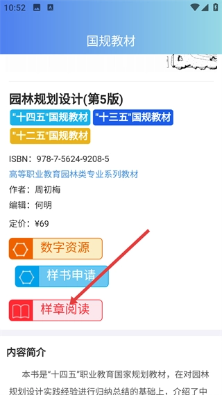 从国家规划教材的列表里,挑选《园林规划设计(第5版)》,然后进入这本教材的详情页面。