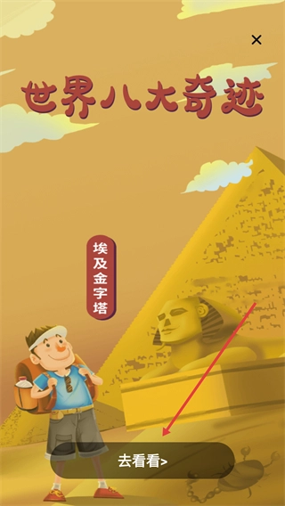 在埃及金字塔的介绍页面中,点击【去看看>】按钮,即可查看埃及胡夫金字塔的详细信息。
