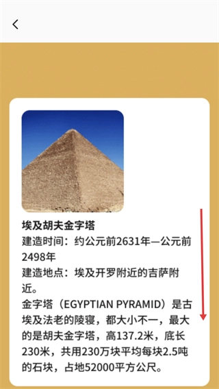 了解完埃及胡夫金字塔的相关信息后,可向下滑动页面,继续浏览世界八大奇迹中其他奇迹的内容。