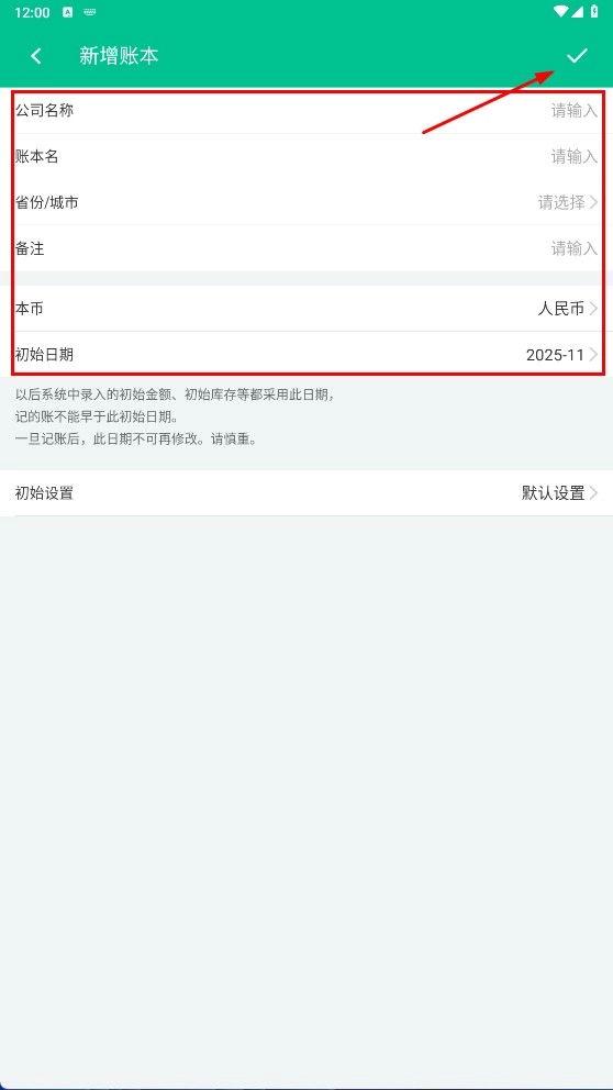 创建新账本时,需填写公司名称、账本名、所在省份与城市、备注等相关信息,选定本币类型和初始日期后,点击确认按钮即可完成账本创建。
