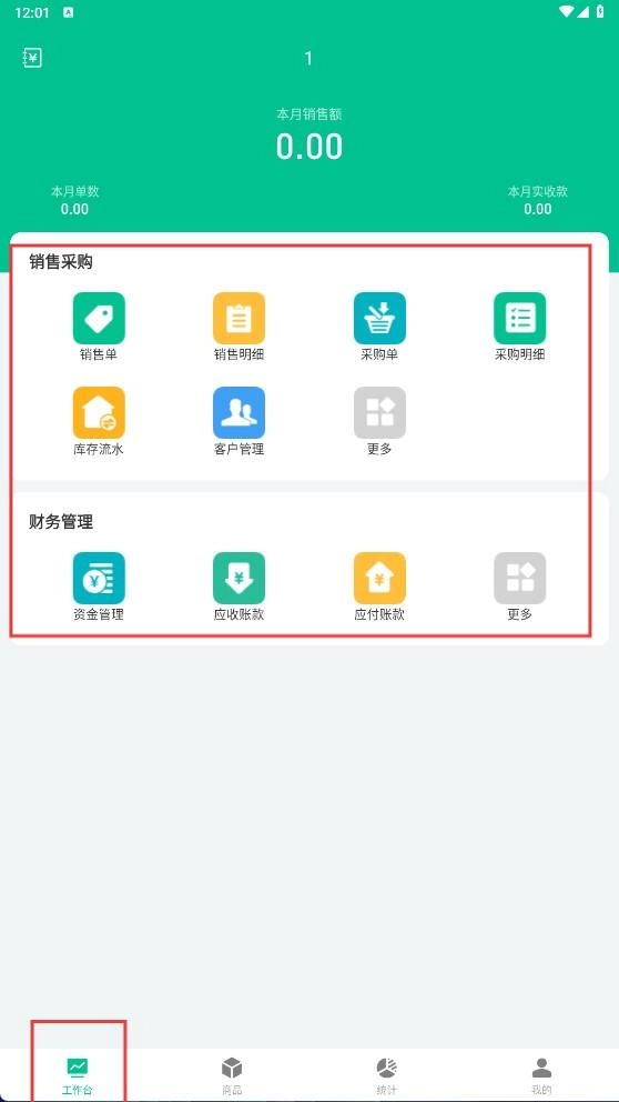 进入【工作台】后,就能利用销售采购(如销售单、采购单等)以及财务管理(像资金管理、应收账款等)的功能模块来开展记账管理工作。