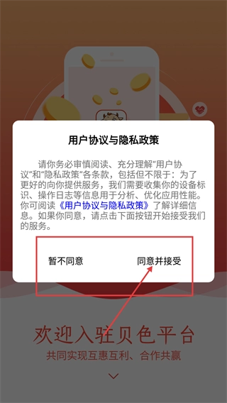 进入平台后,会先弹出《用户协议与隐私政策》确认框,阅读相关条款后点击“同意并接受”按钮,方可进入后续操作流程。