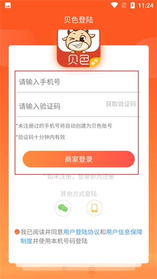 完成手机号和验证码的填写后,点击【商家登录】按钮提交相关信息,若账号尚未注册,系统会自动将其创建为贝色商家账号。