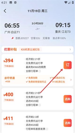 在机票查询结果页面挑选合适的航班,然后进入该航班的详情页面。