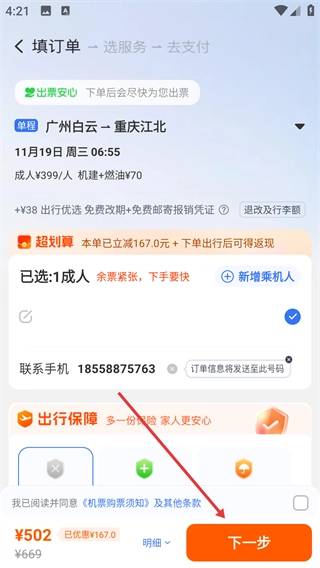 在订单填写页面确认好订单信息后,点击【下一步】按钮,即可完成机票预订流程。