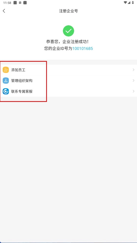 企业完成注册后,后续可通过【添加员工】【管理组织架构】【联系专属客服】等功能开展相关操作。