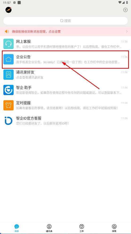 在消息页面点击【企业公告-功能选项】,即可进入对应的提示页面。