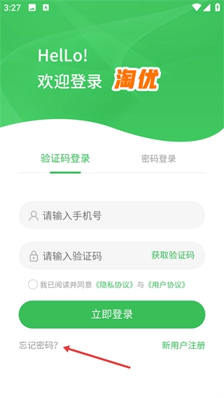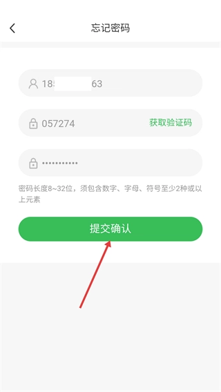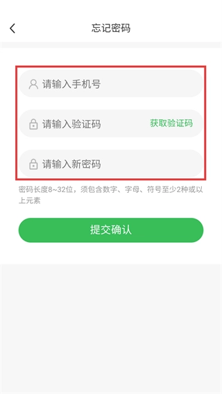 在忘记密码页面输入手机号、验证码和新密码。