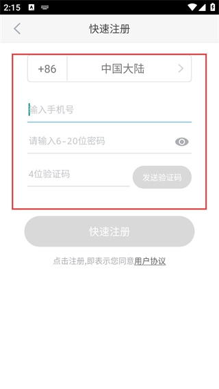 在快速注册页面,先选择对应的地区,接着依次填写手机号、设置6到20位的密码,再输入4位验证码,所有信息填写完毕后点击【快速注册】按钮,就能完成账号创建啦。