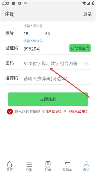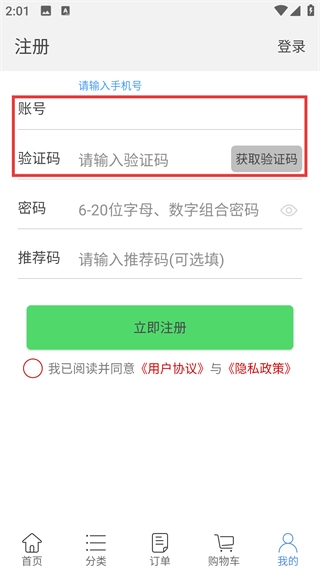 在注册界面填写账号(需为手机号码),通过获取验证码的方式输入对应的验证码,接着设置由字母与数字组合而成、长度在6至20位之间的密码,此外还可根据自身情况选择是否填写推荐码。
