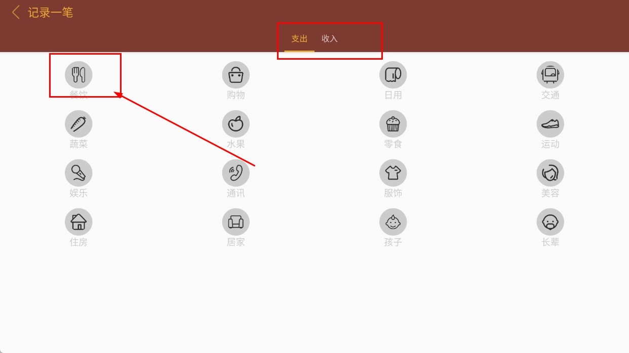 进入【支出-分类】板块,找到并点击【餐饮-图标】,即可完成餐饮类支出的记录操作。