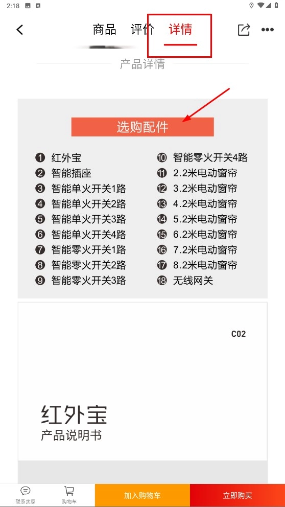 点击【详情-标签】,查看“选购配件”列表以及产品说明书。