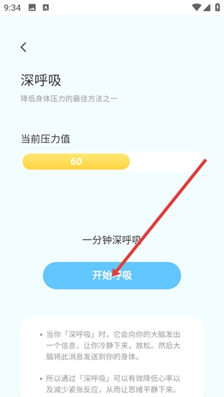 在深呼吸页面,先查看当前的压力值,接着点击【开始呼吸】按钮,就能启动时长为一分钟的深呼吸减压功能。