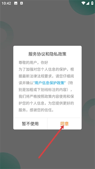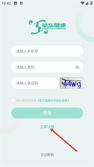 在【服务协议和隐私政策】弹窗中点击【同意】按钮,即可进入宽乐健康的登录界面。