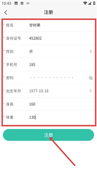 在注册页面填写【姓名】【身份证号】【性别】【手机号】【密码】【出生年月】【身高】【体重】等信息。