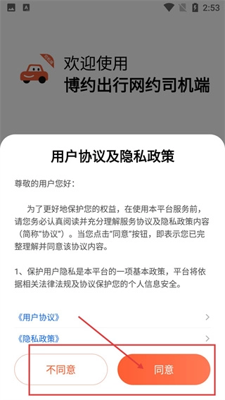 打开该网约车司机端工具应用后,会弹出相关弹窗,在阅读完条款内容后点击【同意】按钮,即可进入手机号输入页面。