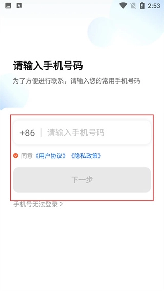 在手机号输入界面,填写日常使用的手机号码,确认勾选相关协议后,点击【下一步】按钮,即可启动验证码的获取流程。