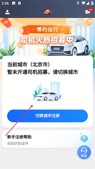 若当前所在城市(例如北京市)暂未开放司机招募,可点击【切换城市注册】按钮,挑选已开通招募服务的城市,随后继续推进司机注册的相关流程。